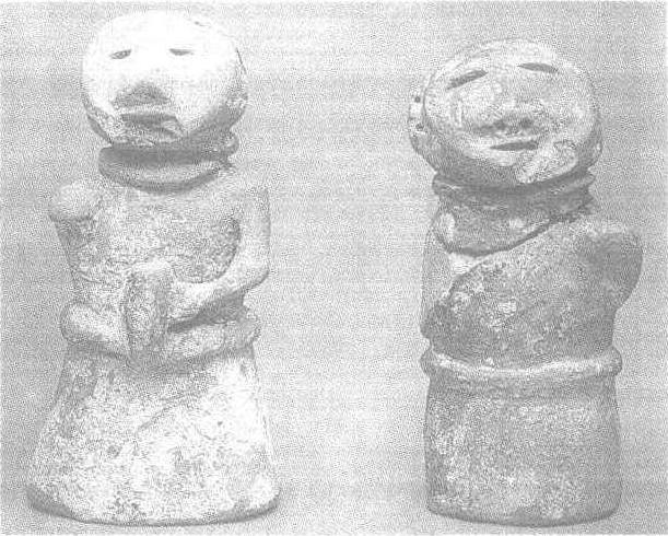 这两件陶俑,出土于河南安阳殷墟,距今已3000多年。俑头部较大,几乎占全身的三分之一。颈部带有枷锁,女俑枷手于前,男俑缚手于后,面部流露出一种痛苦、不屈的表情。整个造型粗犷、古朴,蕴含着 一种内在的巨大的精神力量。从这件雕塑不难看出商代匠师在形体特征的把握上又前进了一大步。