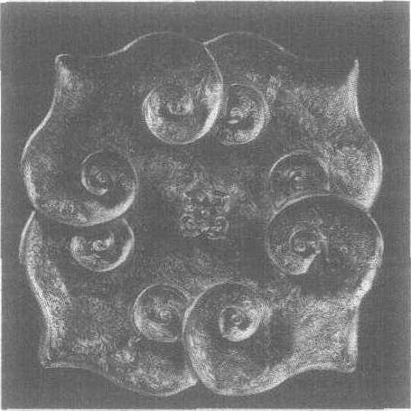 元代制品,1959年在江苏省吴县吕师孟夫妇墓(1304,1315年)中出土,现为南京博物院收藏。高1.3厘米,边长16厘米,厚0.1厘米,重236.44克。造型新奇,方中见圆,以四只凸起的如意云纹叠合成形,系采用锤打、压模工艺制成。盘心有四只微凸的如意云纹组成的柿蒂形,盘内錾刻纤细的缠枝花卉,线条劲利流畅,图案繁密精丽。金盘外底素面无纹,未经光整,留有錾花的印痕,在边缘处錾刻 “闻宣造”款。