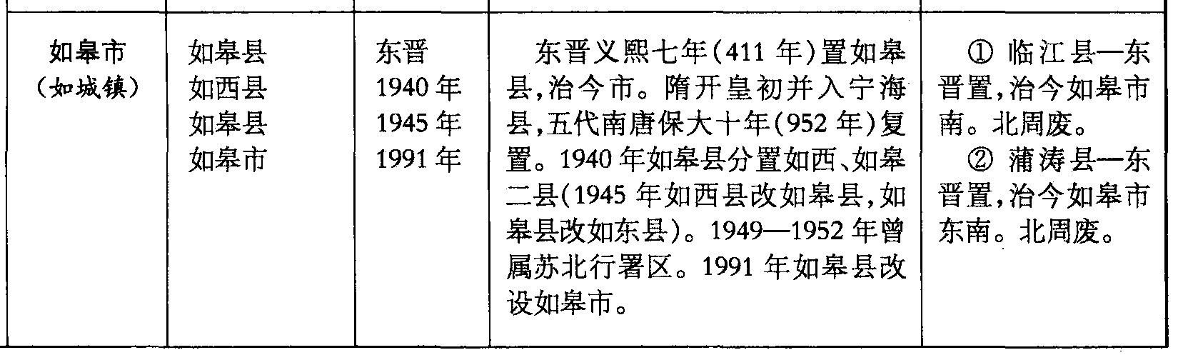 如皋市(如城镇)如皋县如西县如皋县如皋市东晋1940年1945年1991年东晋义熙七年(411年)置如皋县,治今市。隋开皇初并入宁海县,五代南唐保大十年(952年)复置。1940年如皋县分置如西、如皋二县(1945年如西县改如皋县,如皋县改如东县)。1949—1952年曾属苏北行署区。1991年如皋县改设如皋市。❶ 临江县—东晋置,治今如皋市南。北周废。❷ 蒲涛县—东晋置,治今如皋市东南。北周废。