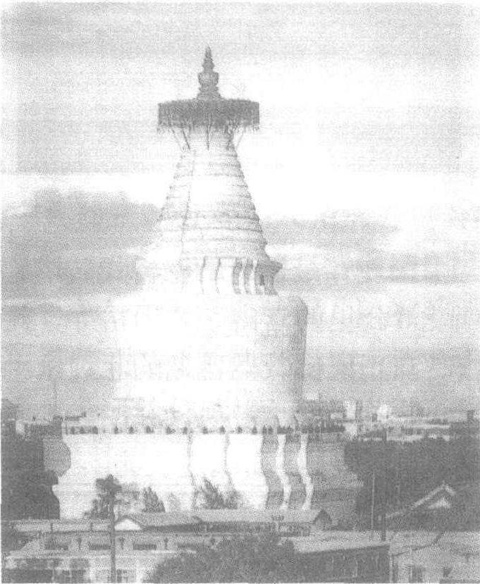 | 释义 | 妙应寺白塔 妙应寺白塔在北京西城区。俗称“白塔”、“喇嘛塔”。元代至元八年始建,历时八年建成。为当时在中国任职的尼泊尔工艺家阿尼哥设计建造。塔成,塔前又建大圣寿万安寺,明代改名妙应寺。塔高五十多米,塔身为白色,覆钵形,上为圆锥形长颈,共十三节。塔顶有一金属宝盖,直径约十米,上覆铜板瓦,四周悬挂三十六个饰以铜制透雕的华曼及铁铃。宝盖上为一铜塔刹,高约五米,重达四吨。整个塔稳重挺拔、雄伟壮丽。 ☚ 佛宫寺释迦塔 真觉寺金刚宝座塔 ☛ 古代名物 > 宗教類(上) > 聖迹寳塔部 > 名塔 > 妙應寺白塔 妙應寺白塔 miàoyìngsìbáitǎ 座落於北京阜城門内之喇嘛塔。塔身潔白。在妙應寺右偏,故稱。始建於遼壽昌二年(公元1096年),元至元八年(公元1271年)重修。塔基呈“亞”字形,上建須彌座二重。塔身由一白堊色覆鉢體與相輪組成,相輪上爲青銅寳蓋及流蘇,寳蓋四周懸掛銅鐸三十六枚。寳蓋頂原置一寳瓶,現爲金色銅質小喇嘛塔。通高十五丈有餘。參見本類“妙應寺。”參閱清·孫承澤《天府廣記·寺廟》、吳長元《宸垣識略·内城四·白塔寺》。