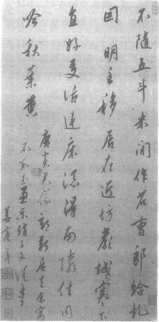 | 释义 | 姜宸英行书五言律诗轴 姜宸英行书五言律诗轴清。纸本。纵64.5厘米,横32.1厘米。四川省博物馆藏。姜宸英(见《姜宸英草书诗轴》条目)书。此五言律诗:“不随五斗米,闲作省曹郎。给札因明主,移居在近坊。严城寒下直,好友话连床。总得南邻伴,同吟秋叶黄。”左下角款署“姜宸英”,下钤<姜宸英印> <西溟>二方印。行书字字独立,参以草书相杂,笔画娟秀潇洒,疏朗流媚,笔力遒劲,深得古人神髓,表现出作者恬澹舒雅、清光淡韵、志气平和的书风。