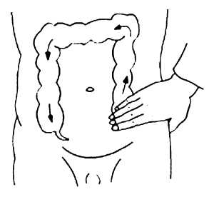 ❷检查者手五指并拢伸直,使之长轴与病人降结肠走行方向垂直,横压住降结肠下部,再沿降结肠方向上推,引起右下腹痛。