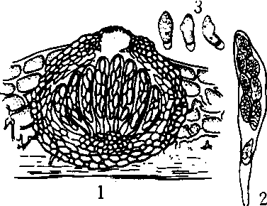 球座菌属 1.子囊腔 2. 子囊 3. 子囊孢子 |
