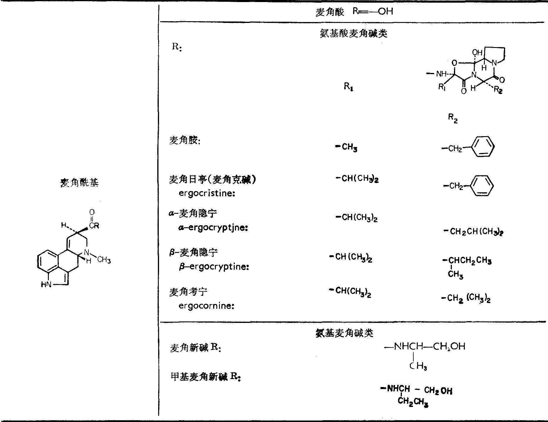 缩宫素能直接兴奋子宫平滑肌,加强其收缩,此作用可为雌激素所促进,小剂量缩宫素能增加妊娠末期子宫的节律性收缩,剂量过大则引起子宫强直性收缩。缩宫素在肌内注射后3~5分钟即出现作用,维持时间约20~30分钟,必要时可静脉滴注,使用时要严格掌握剂量。此外,缩宫素还能使乳腺腺泡周围的肌上皮细胞收缩促进排乳。大剂量缩宫素能松弛血管平滑肌,降低血压,反射地引起心动过速。 口服易为消化液破坏,故无效,肌内注射后吸收良好,3~5分钟内生效,大部分在肝脏破坏,只有少量从小便排泄,妊娠时血浆中有破坏缩宫素的氨肽酶,从而减弱其作用。 缩宫素用于产后出血,肌内注射,每次5~10U,能迅速引起子宫强直收缩,压迫子宫肌层血管而止血。用于催产和引产,宜用小剂量加强子宫收缩力,促进分娩。每次用2~5U,用5%葡萄糖液500ml稀释,缓慢静脉滴注,根据子宫收缩和胎心情况调整滴注速度。过量能引起子宫高频率甚致强直收缩,可致胎儿窒息或子宫破裂,因此作催产引产时需严格掌握剂量,凡产道异常,胎位不正,头盆不称,前置胎盘和有剖腹产史者禁用。 不良反应有面色苍白、出汗、心悸、胸闷,偶可引起荨麻疹。 麦角(ergot) 是寄生在黑麦或其他禾本科植物中的麦角菌[Claviceps purpurea Fr.Tul.]的干燥菌核。麦角中含有多种生物碱,可分两类: ❶氨基酸麦角碱类: 其中有麦角胺和麦角毒。后者是四种麦角碱(ergocristine,α-ergokryptine,β-ergokryptine,ergocornine)的混合物。此类难溶于水,水解后析出氨基酸。 ❷氨基麦角碱类:有麦角新碱和甲基麦角新碱。此类易溶于水,水解后析出胺类。