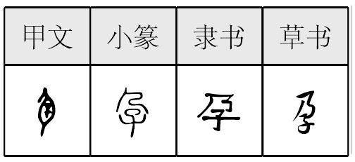 甲骨文从身,内从子,象人腹中有小孩子状。战国和秦代小篆从人形包子。怀胎义。如:孕妇。引申指胎。如:有孕(古汉语说有身)。