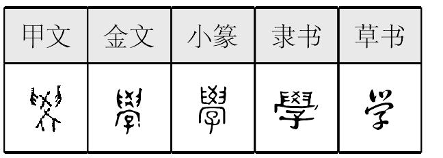 xué表意,甲骨文从双手从爻,爻为算筹,表示手持算筹计算;金文、小篆增宀、子,宀指房屋,表示在室内教育小孩子,隶定为“學”。本义为学习,接受教育,引申为模仿、学问、学校、学派、学科等。《简化字表》类推简作“学”。
