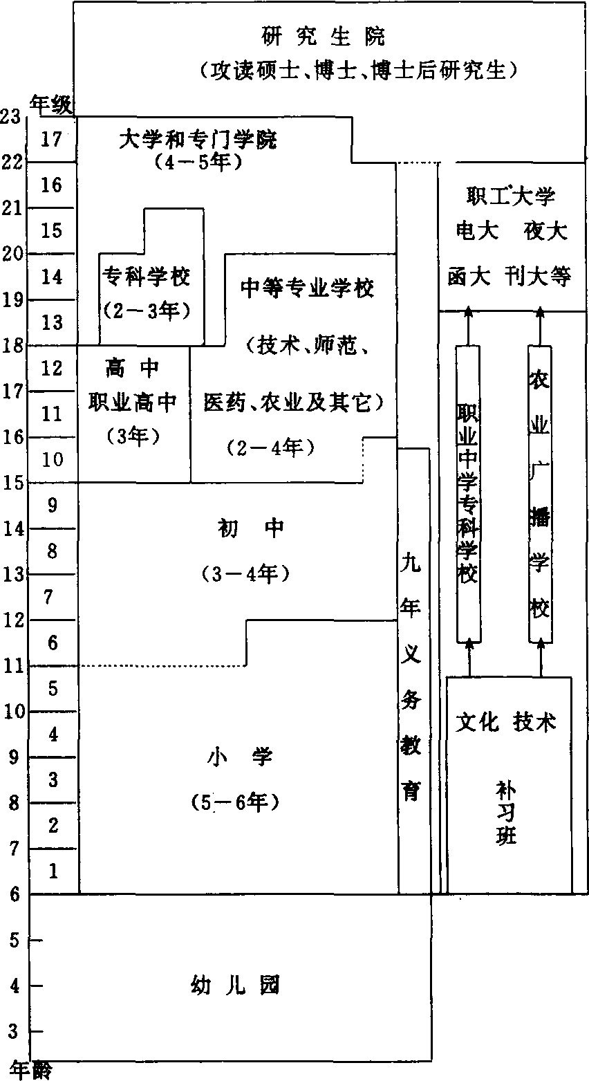 ☚ 关于加强小学法制教育的意见 五年一贯制 ☛ 学制又称“学校系统”。学校教育制度的简称。由国家制定,具有阶级性。它规定各级各类学校的性质、任务、培养目标、入学条件、学习年限以及它们之间的衔接和关系。中国近代学制始于清末,有壬寅学制(1902年)、癸卯学制(1904年)。辛亥革命后有壬子·癸丑学制(1912—1913)、壬戌学制(1922年)。国民党统治时期基本上沿用壬戌学制。中华人民共和国成立以后,1951年政务院颁布了《关于改革学制的决定》,对旧学制进行了根本性的改革。随着中国四化建设发展的需要,学制的改革仍在继续进行中。 学制 学制由国家政府机关统一规定的各级各类学校的教育制度。反映各级各类学校教育的内部结构及相互关系; 规定各级各类学校的性质、任务、入学条件、修业年限等教育方面的内容。中国有三类主要学校:全日制学校、半工半读学校、业余学校。学校系统分为幼儿教育、初等教育、中等教育、高等教育。初等教育主要指小学,招收6、7岁儿童入学、学制6年; 中等教育有全日制中学、中等专业学校,技工(职工) 学校,农业中学及其他半工半读中学、业余中学,学制一般为5—6年;高等教育包括全日制大学、专科学校和各种形式的半工半读学校、业余大学及研究生院,全日制大学,学制为4—5年,其他专科学校的学制一般为2—3年。 ☚ 教育制度 中国学制 ☛ 学制 学制由国家政府机关统一规定的各级各类学校的教育制度。反映各级各类学校教育的内部结构及相互关系;规定各级各类学校的性质、任务、入学条件、修业年限等教育方面的内容。 ☚ 教育制度 学位制度 ☛ 学制educational system;length of schooling |