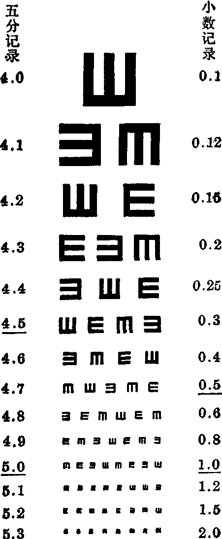 视力表 我国目前各医院常用的远视力表由1952年第九届全国眼科学会推荐,因与国际上许多国家使用的小数制视力表一致,故又名“国际标准视力表”(图1)。1959年又出现缪天荣研制我国的对数视力表(五分记录法)(图2)。该对数视力表是按视标(视角)每增大1.26倍视力记录减0.1的标准设计的。用该表检查的视力可以用算术平均法计算群体的平均视力,也可直接计算视力的标准差及视力的百分位数。由于对数视力表的视标分级比较合理且便于统计,已在科研中得到采用。用 “国际标准视力表”检查的视力,便于国际间进行比较,但在计算平均视力时需要将小数记录折算成五分记录,折算方法见表。