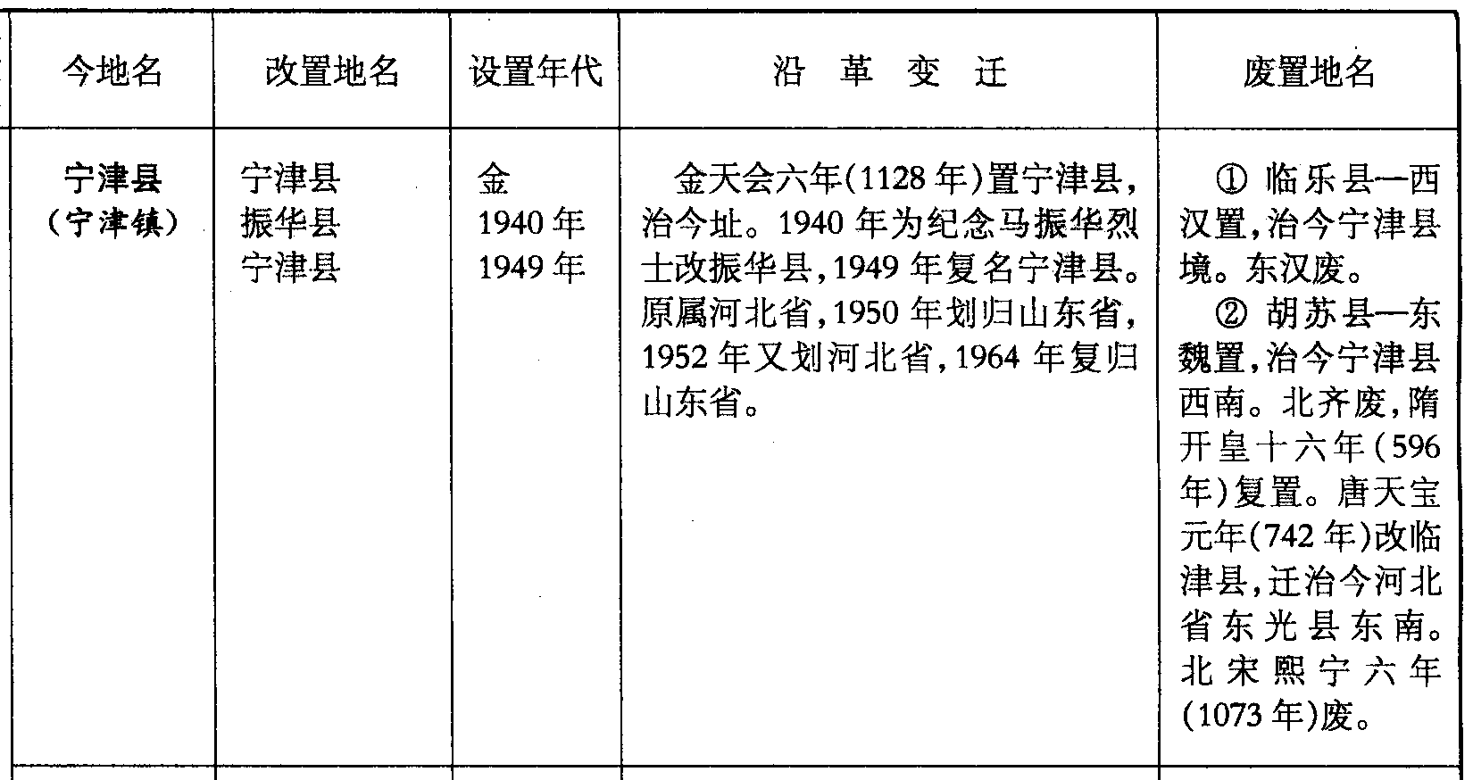 宁津县(宁津镇)宁津县振华县宁津县金1940年1949年金天会六年(1128年)置宁津县,治今址。1940年为纪念马振华烈士改振华县,1949年复名宁津县。原属河北省,1950年划归山东省,1952年又划河北省,1964年复归山东省。❶ 临乐县—西汉置,治今宁津县境。东汉废。❷ 胡苏县—东魏置,治今宁津县西南。北齐废,隋开皇十六年(596年)复置。唐天宝元年(742年)改临津县,迁治今河北省东光县东南。北宋熙宁六年(1073年)废。