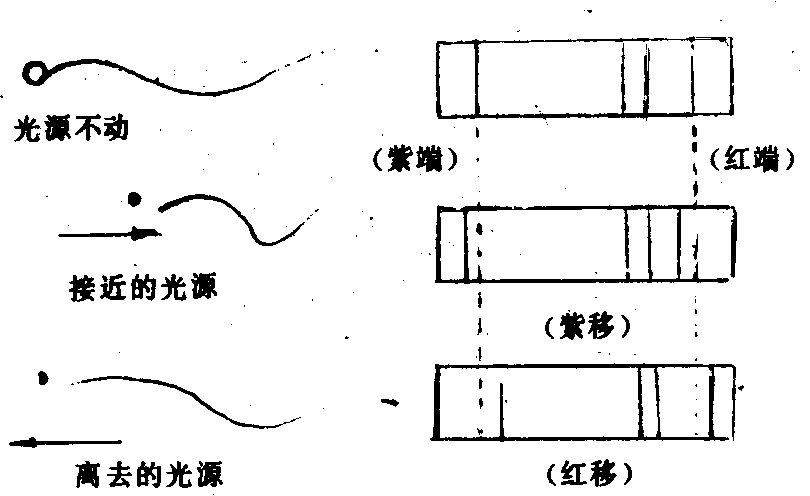 在天文学家使用光谱仪通过各恒星的光谱结构来研究恒星特征的时候,早就注意到一个很普遍的现象,就是恒星光谱谱线的位置,总是偏离在地球上用实验方法标定的标准位置,而且总是向红光的方向偏离。这个现象称为恒星光谱线的红移。从物理学看,一个发出红、橙、黄、绿、兰、靛、紫各种颜色光波的光源,当它静止时所发的混合光颜色与它运动时所发出的混合光颜色并不相同。而同一个光源,如果它向观察接近时,它的颜色将含较多的紫色;当它远离观察者,颜色则更近于红色。如图。