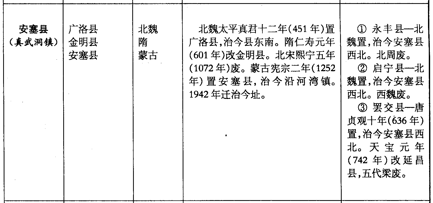 安塞县(真武洞镇)广洛县金明县安塞县北魏隋蒙古北魏太平真君十二年(451年)置广洛县,治今县东南。隋仁寿元年(601年)改金明县。北宋熙宁五年(1072年)废。蒙古宪宗二年(1252年)置安塞县,治今沿河湾镇。1942年迁治今址。❶ 永丰县—北魏置,治今安塞县西北。北周废。❷ 启宁县—北魏置,治今安塞县西北。西魏废。❸ 罢交县—唐贞观十年(636年)置,治今安塞县西北。天宝元年(742年)改延昌县,五代梁废。
