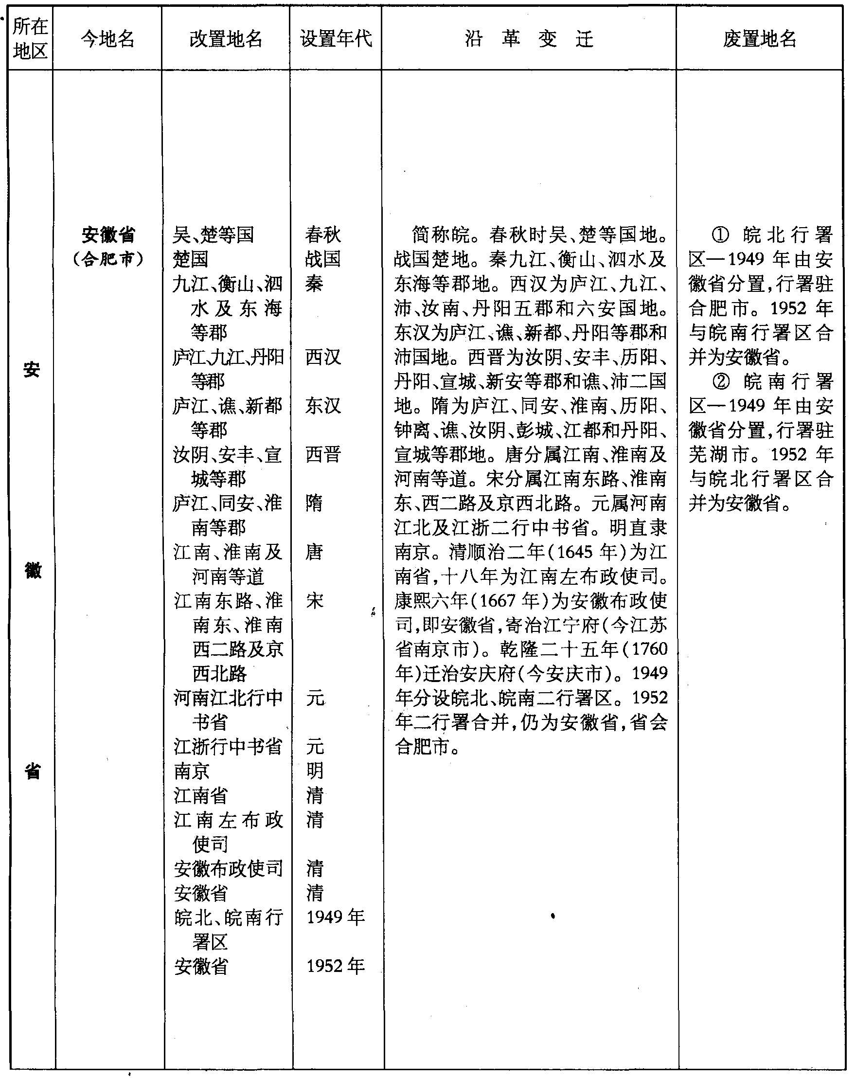 简称皖。春秋时吴、楚等国地。战国楚地。秦九江、衡山、泗水及东海等郡地。西汉为庐江、九江、沛、汝南、丹阳五郡和六安国地。东汉为庐江、谯、新都、丹阳等郡和沛国地。西晋为汝阴、安丰、历阳、丹阳、宣城、新安等郡和谯、沛二国地。隋为庐江、同安、淮南、历阳、钟离、谯、汝阴、彭城、江都和丹阳、宣城等郡地。唐分属江南、淮南及河南等道。宋分属江南东路、淮南东、西二路及京西北路。元属河南江北及江浙二行中书省。明直隶南京。清顺治二年(1645年)为江南省,十八年为江南左布政使司。康熙六年(1667年)为安徽布政使司,即安徽省,寄治江宁府(今江苏省南京市)。乾隆二十五年(1760年)迁治安庆府(今安庆市)。1949年分设皖北、皖南二行署区。1952年二行署合并,仍为安徽省,省会合肥市。