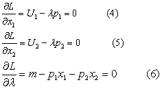 这表示最后支付一个货币单位购买商品1所得的效用等于购买商品2所获得的效用。由(7)还可得: