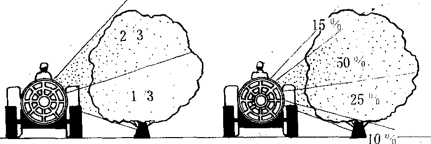 ❸间歇喷雾。利用控制装置使喷雾机具的喷撒部件在离开作物时自动停止喷雾,与作物相遇时再自动喷雾。例如一种光电自控间歇喷雾机 (photoelectric operated intermittentsprayer),只在喷头对准作物时才能喷雾,脱离作用后由光电管自动切断喷雾。 ❹笼罩喷雾。用塑料膜在特制的支架上做成马鞍形的罩,可以笼罩在作物上行走;在罩内配置若干喷头,针对作物进行喷雾。未喷到作物上的部分药液被喷到塑料罩的内侧并流到罩的下缘,用集液槽收集后,通过抽吸系统,吸回药液槽重复使用(见循环喷雾法)。喷撒灭生性除草剂为了防止危及周围的作物,须在喷头部安装一马蹄形罩,使喷出的雾流只能在罩下的杂草上沉积。 |
