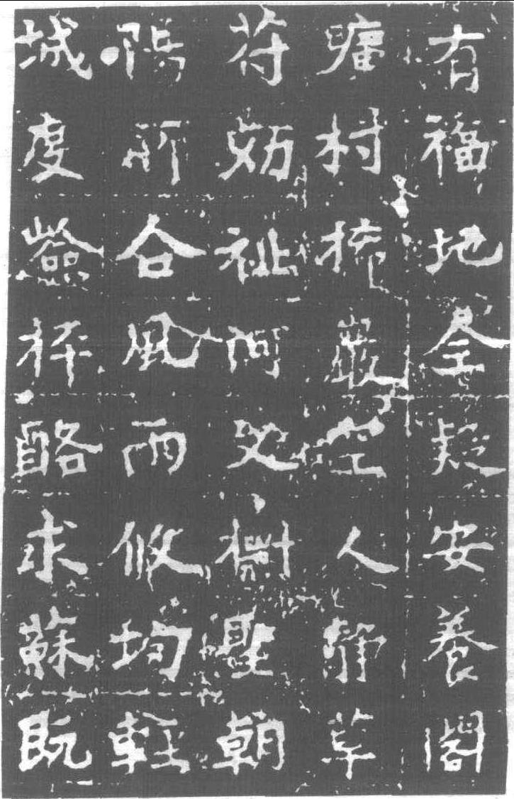 定國寺碑 (局部) 北齊·天保八年 (557) 刻。碑文記趙郡王高睿修寺一事。楷書三十七行,行六十四字。額十字亦楷書。無撰、書者姓名。碑文駢麗,書含隸意,骨力剛健,且富雅致,第鎸刻欠精妙。在河北靈壽縣。而此地另建有同事一碑,惟所記人物不同,曰 〈定國寺慧昭修寺頌記〉。→見【定國寺慧昭修寺頌記】 |