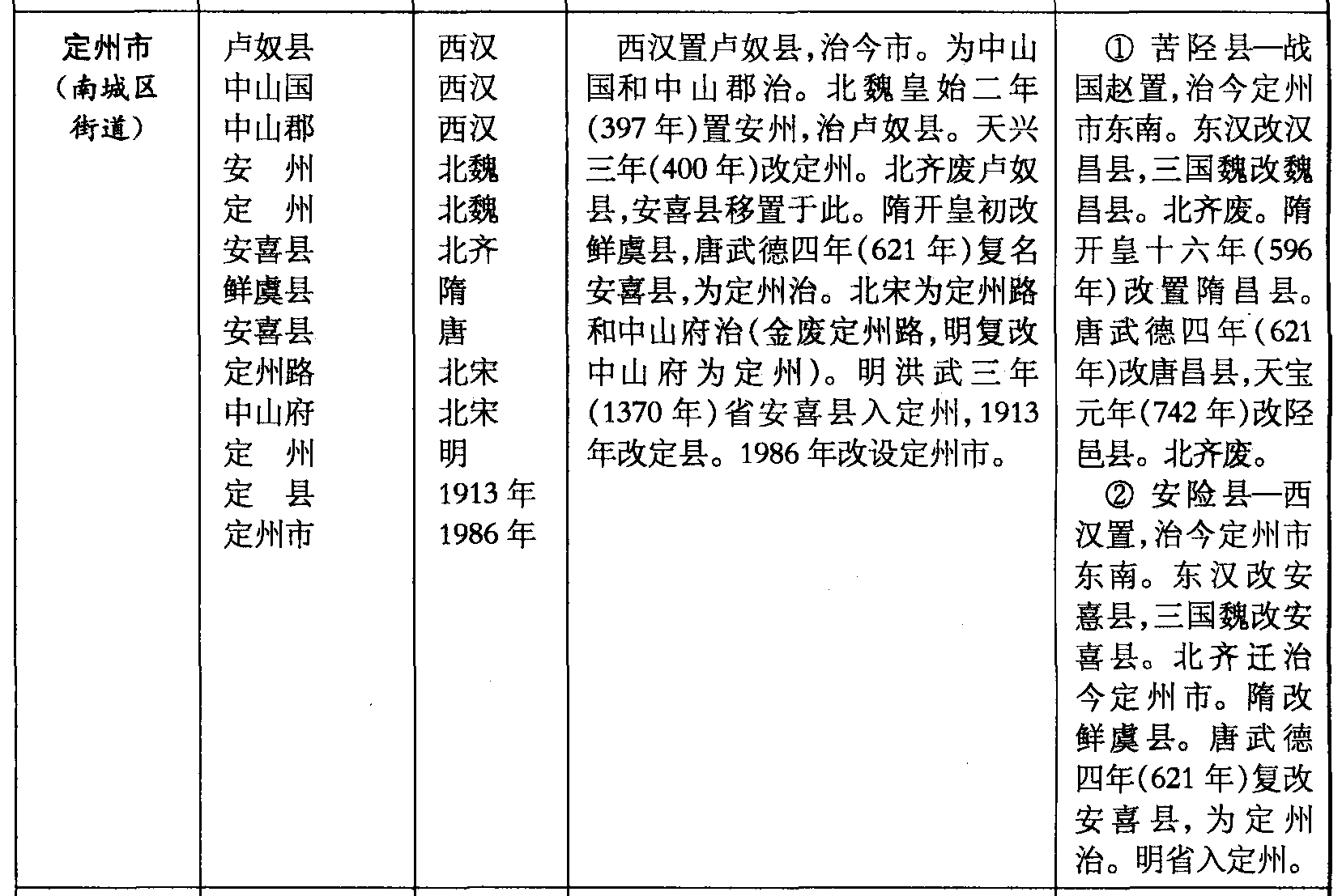 ❷ 安险县—西汉置,治今定州市东南。东汉改安憙县,三国魏改安喜县。北齐迁治今定州市。隋改鲜虞县。唐武德四年(621年)复改安喜县,为定州治。明省入定州。