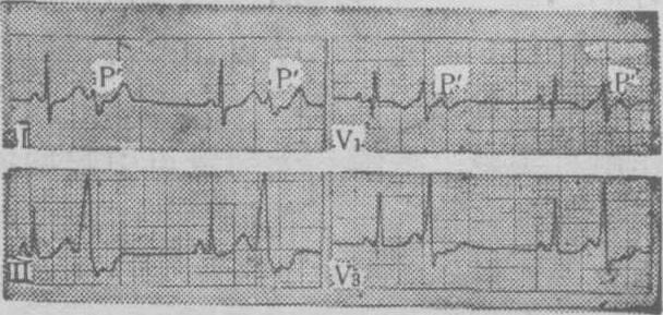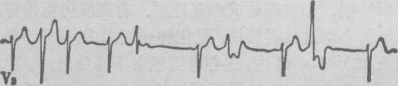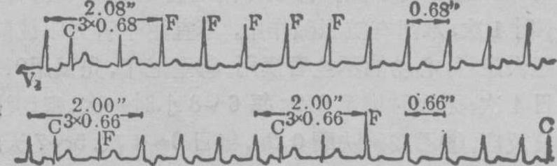 图1 频发室性过早搏动呈二联律 图示每一窦性心搏后有一提前出现的宽大畸形的QRS波群,为室性早搏,呈二联律。早搏逆传至心房,表现为QRS波群后的逆行P′波。室性早搏后有完全代偿间歇。