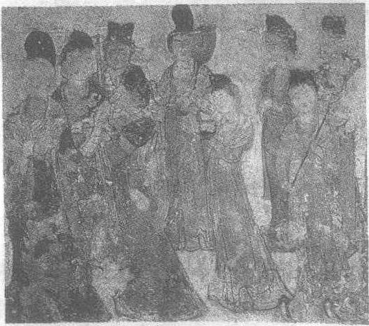 | 释义 | 宫女图壁画 宫女图壁画唐神龙二年(公元706年)。纵177厘米,横198厘米。陕西省乾县乾陵陪葬墓永泰公主墓前室东壁南侧壁画。陕西省博物馆藏。画面中共有九人,为首的一位梳高髻,穿窄袖衫,套短襦,腰系长裙,双手交叉于胸前,神情庄重。其余八人手持烛台、团扇、高足杯、拂子等物。她们的面庞各有其美,体态修长,缓步而行的姿态极尽其妙。面部表情各异,或正面凝注,或若有所思,或含情脉脉,或回首顾盼,充分展现了唐代宫廷妇女的丰姿绰约。在整体构图上,她们高低疏密相间,布局自然而不呆板,彼此有所呼应。画者线条技法娴熟,有的一笔长达数尺,气脉连贯,劲健流畅,富有韵律感。色彩淡雅明洁,服饰略施晕染。人物性格把握良好,整幅作品充满着优雅、舒适的气氛。此幅作品代表着初唐仕女画的最高水平,堪称唐墓壁画中的精品。