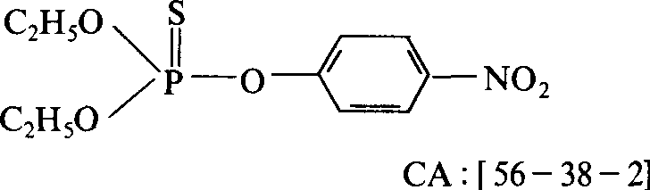 | 释义 | 对硫磷parathion高毒广谱性硫逐式一硫代磷酸酯类杀虫杀螨剂,中国也称作一六○五(E-605)。化学结构式: