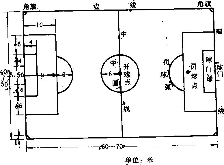 | 释义 | 小足球场地器材 小足球场地器材Xiaozuqiu changdi qicai场地:小足球场呈长方形,长60—70米,宽40—50米。场地划置边线、端线、中线、球门线、罚球区、球门区、角球区、开球点、罚球点、中圈和罚球弧。场内线宽为12厘米,边线和端线的宽度应包括在场地面积内,构成场地内各区的各条线的宽度,包括在各区域的面积内。足球门竖立于足球场两端线的中间,用直径为12厘米的木材或金属制成,门柱和门楣的横截面为方形或圆形。两门柱内侧距离为5.5米,门楣下沿距地面2米。边线与两条端线相交,构成足球场的两条长边(比赛中,球的整体从空中或地面越出边线,则由最后触球出界的对方,在球出界地点掷界外球恢复比赛)。端线与两条边线相交,构成足球场的两条短边(比赛中,由攻方队员触球出守方的端线,由守方罚球门球恢复比赛,若守方队员触球出本方端线,则由攻方在角球区罚角球恢复比赛)。中线将两条边线的中点相连,把足球场划分成面积相等的两个半场。中线的作用是在开球点开球时,双方队员应站在各自的半场,球必须向对方半场踢出,中线又是判罚越位的分界线,在本方半场没有越位犯规。球门线是连接两球门柱内沿的线,当球的整体无论是从空中或地面越过球门线进入球门时,守方算失1球。对方罚点球时,守门员应站在球门线上。小足球场地的球门区是从距球门柱内侧两旁各4米的端线上,向场内各划一条4米长的与端线垂直的线,将这两条线端相连构成球门区。球门区是守方执行球门球的区域,在此区域内,攻方队员不得合理冲撞无球的守门员。罚球区是从距球门柱内侧两旁各10米的端线上,向场内各划一条10米长的与端线垂直的线,将这两条线端相连构成罚球区。罚球区是守门员的领地,他可以用手在此区内触球。如队员在本方罚球区内被判罚直接任意球时,应由对方罚点球。队员在本方罚球区内执行任意球时,对方队员应退出罚球区,主罚队员必须把球直接踢出罚球区,比赛才算开始。角球区是以边线与端线交点的外沿为圆心,1米为半径,向场内划一个弧,使之与边线和端线相连而构成的区域。它的用途是当队员触球出本方端线时, 由对方在角球区罚角球恢复比赛。开球点在球场的正中央,是一个直径为21—23厘米的圆点,上下半时比赛开始或失球一方开球时,均在此点执行开球。罚球点在距球门线中央9米处,是一个直径为21—23厘米的圆点,防守队员在本方罚球区内被判罚直接任意球时, 由对方在罚球点上执行点球。中圈是以开球点为圆心,6米为半径划一个圆,一方开球时,对方队员必须退出中圈以外。罚球弧在球门正前方罚球区外,以罚球点为圆心,6米为半径划弧与罚球区线相交形成一个弧,在执行点球时,除守门员和主罚点球的队员外, 双方其他队员均不可侵