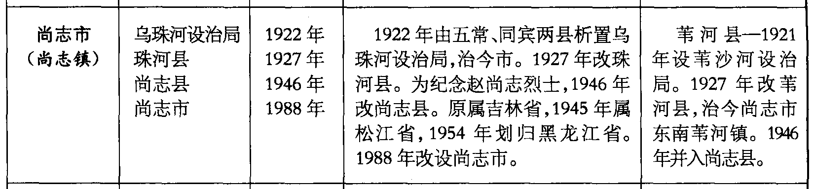 尚志市(尚志镇)乌珠河设治局珠河县尚志县尚志市1922年1927年1946年1988年1922年由五常、同宾两县析置乌珠河设治局,治今市。1927年改珠河县。为纪念赵尚志烈士,1946年改尚志县。原属吉林省,1945年属松江省,1954年划归黑龙江省。1988年改设尚志市。苇河县—1921年设苇沙河设治局。1927年改苇河县,治今尚志市东南苇河镇。1946年并入尚志县。
