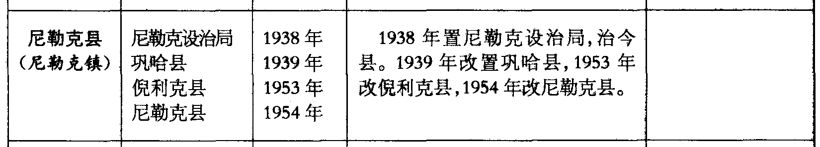 尼勒克县(尼勒克镇)尼勒克设治局巩哈县倪利克县尼勒克县1938年1939年1953年1954年1938年置尼勒克设治局,治今县。1939年改置巩哈县,1953年改倪利克县,1954年改尼勒克县。