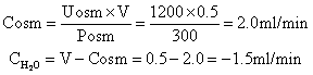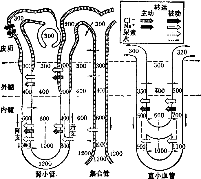 尿浓缩的机理——逆流系统假说示意图 除了Na和Cl离子外,尿素也是造成髓质高渗的重要成分。这里组织液中的尿素是由内髓部的集合管中透出的,可以被动地转运入髓襻升降两支的细段,然后经过远曲小管而聚积于皮质和外髓部的集合管中,在抗利尿激素作用下,一部分尿素可由内髓部的集合管转到组织液,其余的随尿排出(见图)。 髓质直小血管的逆流交换作用 肾髓质组织间液的高渗浓度梯度形成后能够保持相对稳定状态,有赖于血液在髓质的U形直小血管中逆向流动时不断地与其周围的组织间液被动地转运溶质和水(参见图的右半)。这种简单的物质转运形式称为逆流交换作用,其关键在于直小血管的管壁通透性很大。由于髓质的组织液中存在着高渗的浓度梯度,当血液在直小血管中流动时,髓质组织液中的NaCl和尿素等溶质得以透入直小血管的降支,相应地提高了其中血浆的渗透浓度;当血液返折于升支时,由于升支中血浆的渗透浓度略高于组织液,于是有一部分溶质透出管外而回到组织液。水的透过方向则与溶质相反。这种逆流交换的生理意义是使髓质组织液中的溶质不易被血流大量带走,从而能保持组织液的渗透浓度相对稳定。 集合管在尿浓缩和稀释过程中的作用 浓缩尿或稀释尿的最后形成,取决于集合管的通透性,以及集合管内与髓质间液的渗透平衡。机体在缺水时,抗利尿激素分泌增加,于是便加强了远曲小管和集合管,特别是后者对水的通透性,加之集合管系经过高渗的髓质区而至肾盏,故其中的水分大量外渗到髓质的组织间液中,直至达到渗透平衡时为止,这就极大地提高了集合管内尿液的渗透浓度,结果所排出的终尿将是浓缩尿; 如果机体内水分过多,则由于抗利尿激素的分泌受抑制,集合管中水分不被重吸收或吸收很少,于是终尿将是稀释尿。 激素对尿浓缩和稀释的调节 尿浓缩和稀释的过程受到一些激素的调节,抗利尿激素能加强远曲小管和集合管,特别是后者对水的重吸收。在机体缺水时,抗利尿激素分泌增加,于是小管液中的水分被重吸收而增加,这样一方面保存了体液中的含水量,另方面排出了少量高浓缩的尿。反之,当抗利尿激素分泌受阻时,则排出大量稀释尿。 醛固酮对肾的作用主要是“保钠排钾”,它在促进远曲小管和集合管对钠的重吸收的同时,继发地促进氯与水的重吸收,结果细胞外液量也等渗地增加。这是醛固酮的作用与抗利尿激素不同之处,因为后者只促进游离水的重吸收。所以醛固酮对水的重吸收作用固然明显地影响血浆量和尿量,但并不直接影响血浆和尿的渗透压,因而与尿的浓缩和稀释关系较小。 影响尿浓缩和稀释的因素 尿浓缩和稀释的过程受到下列因素的影响。 髓襻逆流倍增作用的减弱 凡肾脏疾患损及内髓,特别是乳头部组织时,将使尿浓缩能力减弱。例如慢性肾盂肾炎引起的肾髓质纤维化;肾囊肿引起的髓质萎缩;钙盐在肾髓质沉积等等,都将使髓质的逆流系统遭到不同程度的破坏,而减弱尿浓缩的能力。凡能影响髓襻升支粗段对Cl-主动转运的各种因素,必将影响尿量的排出。强效利尿药如速尿和利尿酸,其作用被认为是在于抑制髓襻升支粗段Cl-的主动转运,使髓质组织液的高渗梯度难于形成,从而极大地减少水的渗透性重吸收,引起稀释尿的大量排出。 此外,尿素在形成髓质组织液高渗梯度中起着重要作用,而尿素来自蛋白质的代谢,故在营养不良时,尿浓缩能力减弱。实验表明,给予尿素,可使缺乏蛋白质食物的大白鼠提高尿的浓缩能力。老年人尿浓缩能力衰退者,只要肾髓质结构正常,也可借助于蛋白质食物的增加而得到改善。 直小血管逆流交换作用的减弱 直小血管的逆流交换作用在保持肾髓质高渗梯度中起重要作用,故直小血管的血流变化也将影响尿的浓缩程度。例如当直小血管血流加快时,血浆中的NaCl和尿素等可被大量带走,以致髓质间液难以保持高渗;高血压病初期累及肾脏时,尿浓缩能力降低,也可从肾髓质小血管血流加快来得到解释。在失血性休克发展到一定程度时,由于交感神经兴奋,引起肾内血流量重新分布,皮质血管收缩,血流量减少;而髓质血管受神经作用较小,直小血管血流量相对地较多,结果髓质间液高渗梯度难以保持,以致患者不能排出浓缩尿。 集合管对水通透性的改变 如果集合管管壁本身有病变,如肾脏淀粉样变性必将影响到集合管对水的重吸收,使尿的浓缩能力降低。 此外,如果抗利尿激素释放减少或缺乏,造成集合管管壁对水的通透性显著降低时,尿液的浓缩程度将显著下降。 渗透物质和游离水的清除率 肾对尿浓缩和稀释的能力可以用渗透活性物质清除率 (简称渗透物质清除率Cosm)和游离水清除率(CH2O)来测定。 渗透物质清除率系指单位时间内,有多少血浆清除了其中所含的与尿中相等的渗透物质总量,以ml/min为单位,其计算式如下: ![]() 上式V为单位时间内的尿量(ml/min),Uosm和Posm分别为尿和血浆中的渗透浓度(mOsm/L),可以冰点下降法测定,也可简单地从比重来推算。正常成人在空腹时,渗透物质清除率约为2~3ml/min。 游离水清除率系指在单位时间内,肾的排尿量与渗透物质清除率之差,单位也为ml/min: CH2O=V-Cosm (2) 依照以上二式,如果尿和血浆的渗透浓度相等,即所排的是等渗尿,Uosm=Posm,则游离水清除率将为零(V-Cosm=0)。 如果尿为高渗,尿的渗透浓度比血浆的大得多,而尿量极少。如:Uosm=1200m