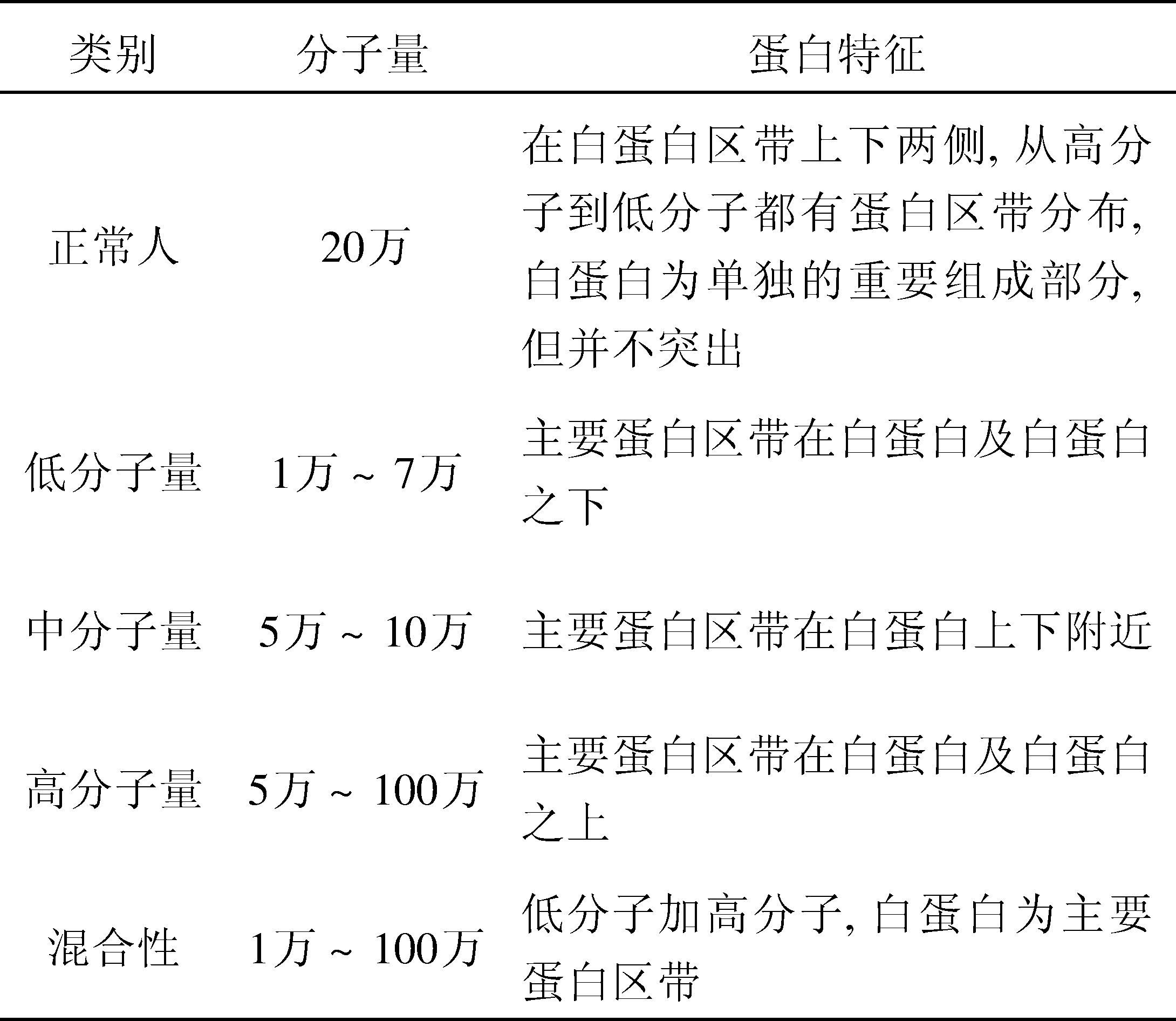 应用十二烷基硫酸钠——聚丙烯酰胺凝胶电泳法(SDS-PAGE),将尿中蛋白按其分子量的大小顺序分为不同组,依据尿中蛋白为低分子 、中分子、高分子或者混合性的结果估计肾脏病损程度。正常参考值见下表: