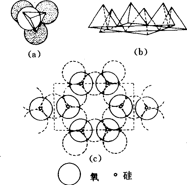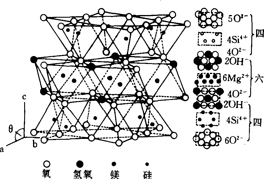 层状硅酸盐按单元层内四面体片与八面体片的比例分为2:1和1:1两种层型。滑石属2:1型(图3),上下两片四面体片上的顶端氧都朝向中间,充当Mg2+的配位阴离子。可是,每6个顶端氧的中心都留着一个空缺,需要由1个OH-来补足Mg2+的配位数。2:1型单元层的上下两面都有四面体底面氧组成的六方网孔,(OH)-就正对着这些孔。