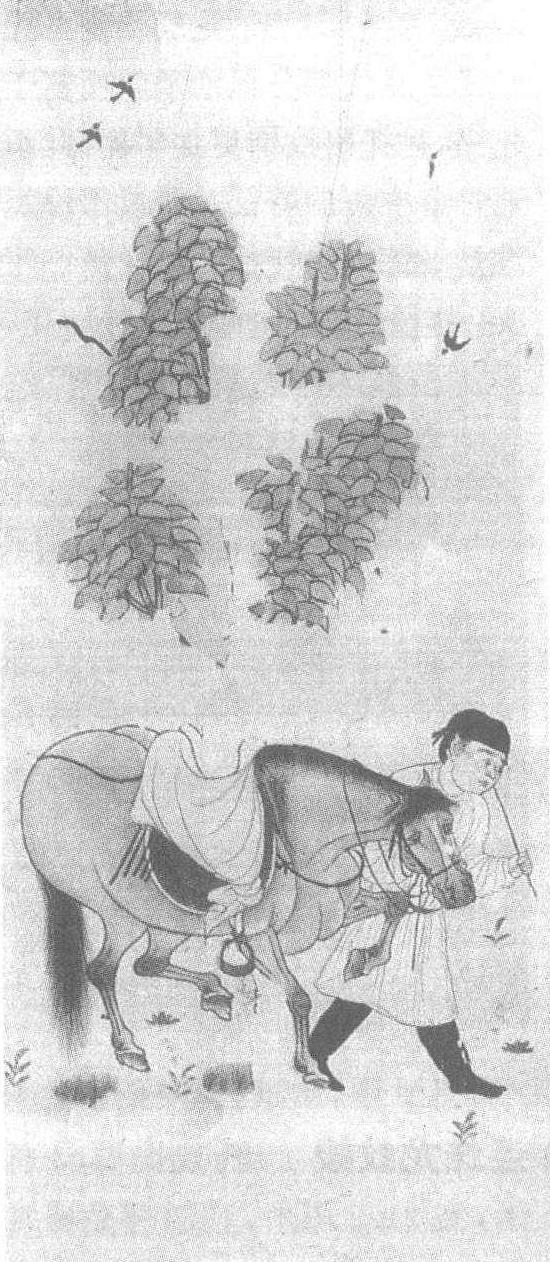 唐。绢本设色。纵53.5厘米,横22.3厘米。新疆维吾尔自治区吐鲁番阿斯塔那188号墓出土。新疆维吾尔自治区博物馆藏。该墓出有八扇牧马屏风。据记载,墓主人麹仙妃“晨摇彩笔,晚弄琼梭”,因此它们可能是其生前亲笔所作。屏风多已破损,此图较完整。画马夫牵着一匹骏马在树下草坪上低头前行。马体宽肥、强壮,肌腱凸出,鞍鞯齐整,表情驯顺。马夫乌帽、白袍、皂靴。一手牵马,一手持鞭,眉头皱起,眼睛盯着地面,显得有些忧虑。天空中白云朵朵,燕雀上下翻飞,一副明丽的景色。作者用笔刚劲,以单线勾勒,并结合恰当的晕染,出色地体现了马匹肌骨的质感。