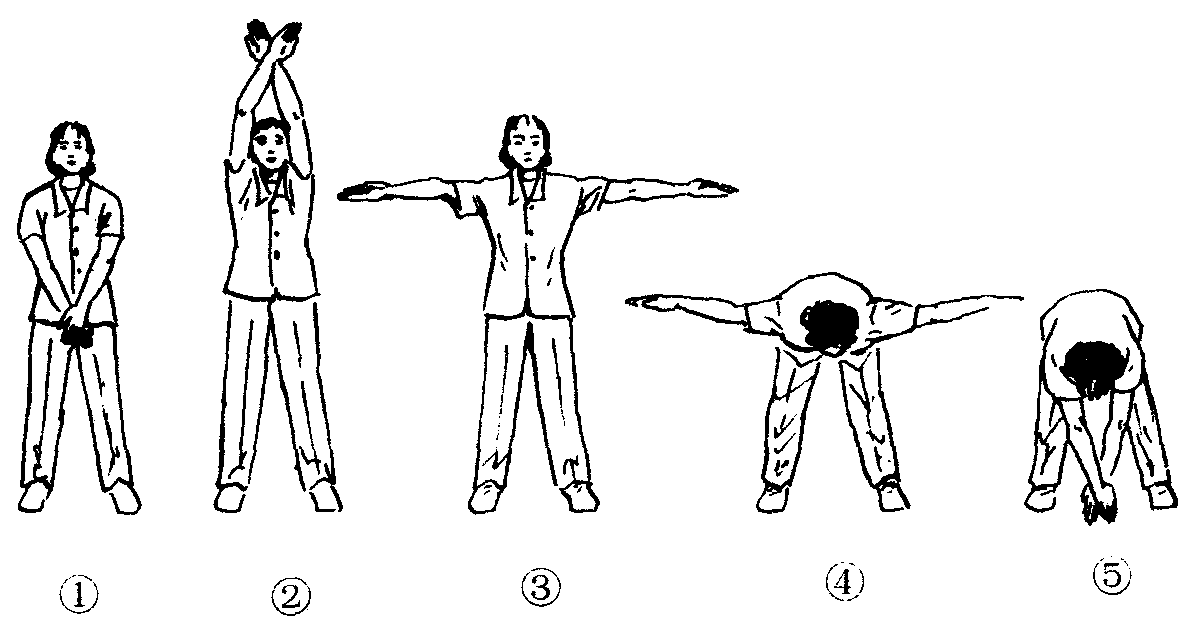 ❹一样,最后一拍还原成预备姿势。共做4个8拍。注意事项:上体挺腰前屈或伸直时,要“挺腰”,以增加腰部活动;上体前屈时两膝不得弯曲,两手尽量触地。此功法对颈、背及腰部酸痛有较好的治疗效果。