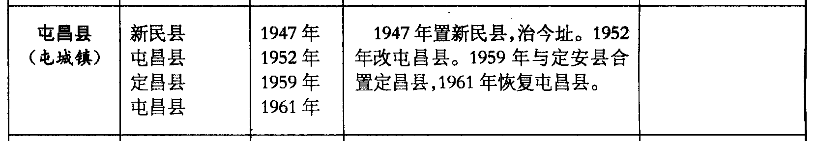 屯昌县(屯城镇)新民县屯昌县定昌县屯昌县1947年1952年1959年1961年1947年置新民县,治今址。1952年改屯昌县。1959年与定安县合置定昌县,1961年恢复屯昌县。