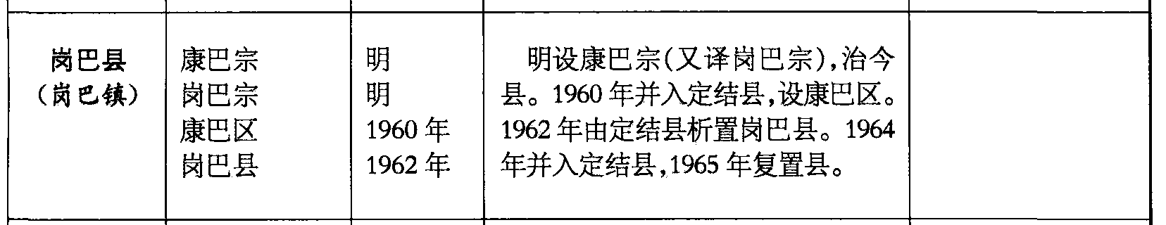 岗巴县(岗巴镇)康巴宗岗巴宗康巴区岗巴县明明1960年1962年明设康巴宗(又译岗巴宗),治今县。1960年并入定结县,设康巴区。1962年由定结县析置岗巴县。1964年并入定结县,1965年复置县。