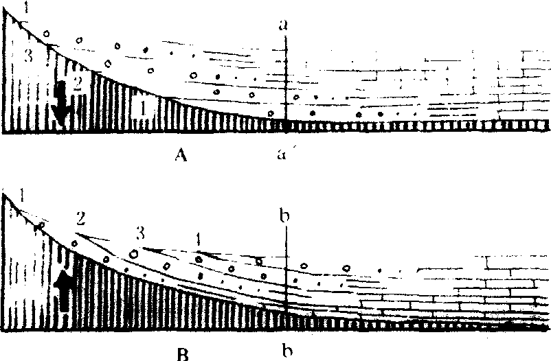 海侵层位(A)和海退层位(B) 1、2、3、4.海面位置的变化;aa′、bb′.垂直剖面 ☚ 地壳运动 岩层接触关系 ☛ |