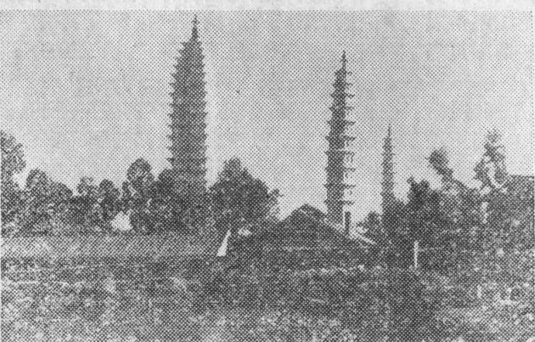 | 释义 | 崇圣寺三塔 崇圣寺三塔在云南大理县城西北郊的崇圣寺。三塔中一大二小,成三角形排列。大塔名千寻塔,高六十多米,为十六层密檐式建筑,方形,中空。各层正面中央开有券龛,以置大理石佛像。约建于唐代南诏保和时期。两小塔均为八角形实心砖塔,十层,高四十多米,塔身涂白色泥皮,各层分别雕有券龛、佛像、莲花、瑞云、花瓶等。塔顶各有三只铜葫芦。约建于五代时期。 ☚ 小雁塔 开元寺塔 ☛ 崇圣寺三塔 在云南大理点苍山应乐峰下崇圣寺内,亦称大理三塔。始建年代约在9世纪20年代唐长庆年间,三塔鼎足而立,大塔方形,共16层,高69米余(或58米余),线条流畅,造型美观。塔基上有“永镇山川”四字。塔内每层开券龛,置白色犬理石佛像一尊。南北两小塔,皆为八角形,实心,十层,高42米余(或38米余)。每层均雕有佛像、莲花、宝瓶等。 古代名物 > 宗教類(上) > 聖迹寳塔部 > 名塔 > 崇聖寺三塔 崇聖寺三塔 chóngshèngsìsāntǎ 座落於雲南大理縣城西北崇聖寺。塔凡三座,因稱。主塔名千尋塔,始建於唐代南詔國豐祐年間。方形,十六級,高二十丈七尺有餘,屬密檐式磚塔。塔頂四角各有一只銅鑄金鵬鳥,傳說用以鎮壓洱海之龍妖水怪。每層四面設龕,相對兩龕内供佛像,另兩龕爲窗洞。1978年維修時,在塔頂發現各種佛像幾百尊,有重二斤二兩七錢之純金觀音像、金質釋迦牟尼佛坐像等。千尋塔稍後,有南北兩座小塔,建於五代。兩塔均爲實心,八角形,十級,高十二丈六尺。塔身均塗一層白色泥皮,各層分别雕券龕、佛像、蓮花、瑞雲、花瓶等。與千尋塔合爲一組,俗稱大理三塔。參閱乾隆《大清一統志·大理府·寺觀》、民國《雲南通志·宗教考·佛教》、又《祠祀考·寺觀》。 崇圣寺三塔亦名“大理三塔”、“大理崇圣寺塔”等。在云南大理市旧县城西北苍山第一峰下原崇圣寺前。寺东为千寻塔,正式名称“法界通灵明道乘塔”,俗称“大塔”或“中塔”。建于唐南诏晚期。外方内空,自下而上逐渐收缩, 高69.13米,系多层密檐式砖塔,十六层。塔身最下部为石砌台基,高1.1米; 上层台基为砖砌须弥座, 高1.9米。塔内有井字形梯,原可分层而上。砖上有的兼有梵文和汉字, 各层神龛和顶部供藏各种佛像等大量文物,并有梵、藏、汉文写经。虽经历代修葺,仍保持唐代建筑风格,造型与西安市小雁塔相似。寺南、寺北均为小塔。约为五代或宋大理国初期建筑。各高42.19米,均系八角形多层式实心砖塔,各十层。三塔坐西面东,排列成三角形,千百年来,虽迭遭地震和风雨剥蚀仍巍然屹立于苍山洱海之间, 系云南现存最古砖石结构建筑物, 为研究我国古代建筑和佛教及南诏、大理国史的重要实物资料。解放后被列为全国重点文物保护单位。