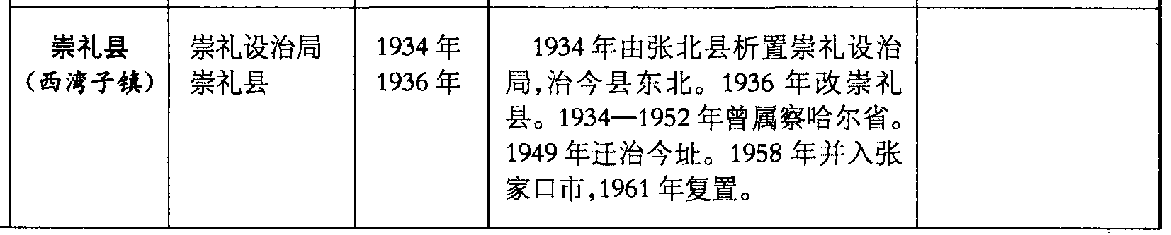 崇礼县(西湾子镇)崇礼设治局崇礼县1934年1936年1934年由张北县析置崇礼设治局,治今县东北。1936年改崇礼县。1934—1952年曾属察哈尔省。1949年迁治今址。1958年并入张家口市,1961年复置。