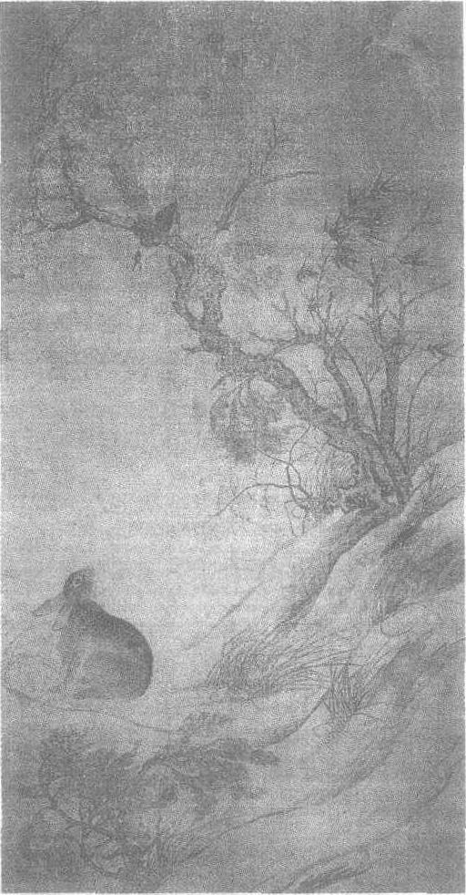 立轴,绢本,淡设色。画中一片深秋肃杀之气。斜坡上伸出一枯木,枝桠错节; 旁有一竹随风偃仰; 坡下劲草随之律动。两只鹊鸟顶风栖飞,一只已落在枝上,正扑打着翅膀,张嘴鸣叫另一只展翅收尾正欲停在枝上。树下一只野兔似被鸣叫声惊动,抬起右爪,回首向上与双鹊对视。它双目圆睁,双耳低垂,鼻子翕动,不知是对鹊鸟的到来感到喜悦还是恐惧。画面中除坡石外无一物是静的。树、竹、草以及回首观望的野兔构成右转的动势;而逆风而行的鹊鸟却从画面右上角向左下斜插下来,更添了画中动荡肃杀的气氛。