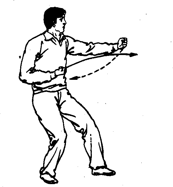 ❷左拳打出时,右拳要用力回拉。右崩拳和左崩拳连续向前打数次或前进一段距离后可转身往回继续练习。崩拳转身的动作是:打出右拳之后(图2—4—65—