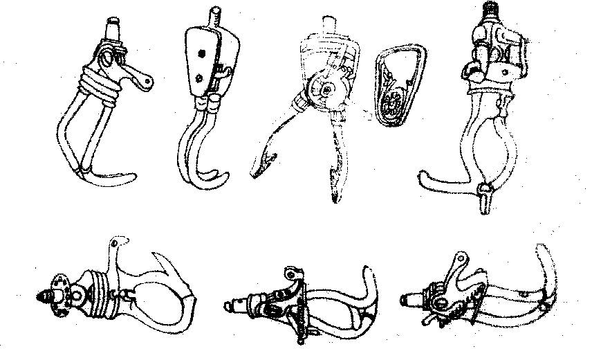 图4 钩状手 钩状手实际上是一种具有两个钩形手指结构的机械假手。它有动力牵引装置,两个手指钩可以主动地开闭。其操纵方式和机械假手完全相同,即利用肩部的动作拉动牵引索开手,依靠装在手上弹簧或橡皮筋闭手 (见图3)。但由于其外形不象人手,所以国内习惯上看作一种工具手,应用得比较普遍,而且有多种形式,如图4所能勾取重物,还能捏取细薄的物件。这是比普通机械假手优越之处。另外,只要将钩状手的腕部连杆作成与机械假手或装饰假手的一样,便可根据情况,随时方便地换用各种手头。 ☚ 装饰上肢假肢 牵引式机械假手 ☛ |