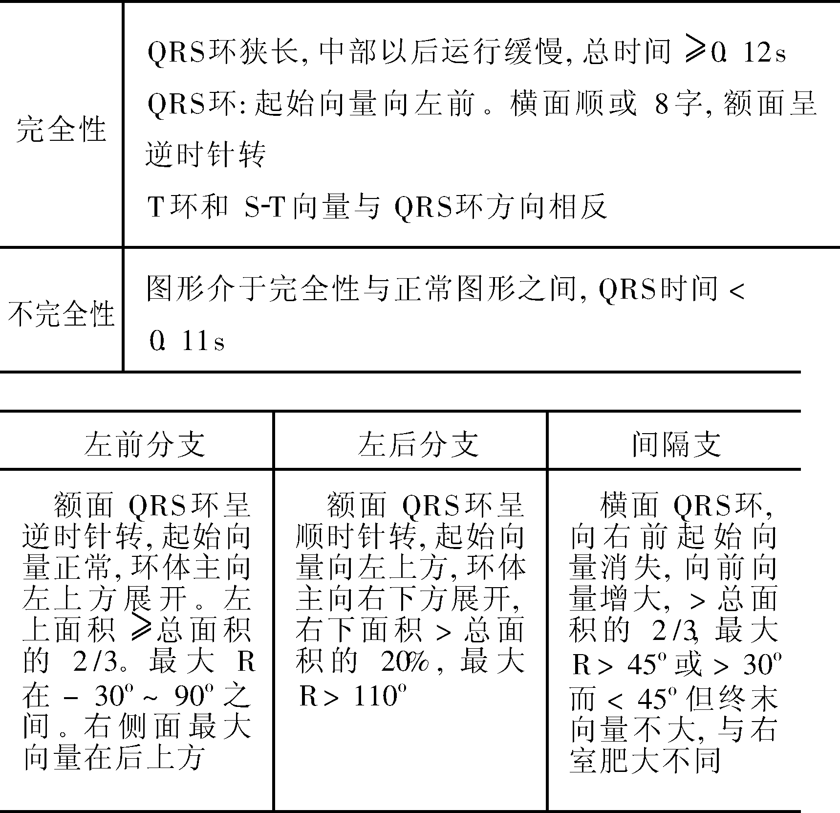 其向量图特征主要见于横面,起始0.01~0.02s的向量向右前,呈逆钟向旋转,但在0.02~0.03s之后的向量均呈顺钟向旋转,最大QRS向量位于左后,环的中部传导延缓,T环旋转方向与QRS环相反,若与QRS环一致,则表示伴有心肌缺血。左束支传导阻滞的QRS环形常较窄长,若环向后展开或环体光滑而电压增大,则提示伴有明显的左室肥大。其左束支阻滞的诊断要点见下表。若QRS环扭曲畸形,则表示伴广泛的心肌病变或心肌梗死。