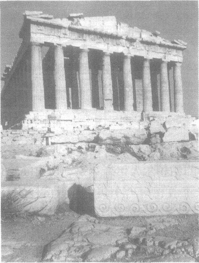 雅典卫城中祀奉雅典守护神雅典娜的神庙。始建于公元前447年,完成于公元前432年,为纪念雅典战胜波斯侵略者的胜利而建。是希腊神庙中最早和最典型的形式,采用长方形平面的列柱围廊式,东面和西面的柱廊有8根列柱,南北各有17根列柱,所有柱子均向后倾侧7cm,各边列柱又向中央略有倾侧,使柱廊更显高耸稳定。神庙的三层基座台阶和上侧山花的檐部,均在中部略为起拱,防止了建筑中部下陷的感觉,四根角柱均略为加粗,开间稍加收缩,以校正角柱在天空明亮的背景下显得细小端部开间过大的错觉,充分反映了古希腊建筑师在运用视觉原理对建筑进行细致入微的设计方面,已达到了很高的水平。神庙外廊的多立克柱式比例优美均称,具有饱满挺拔和开朗的风格,雕刻精致,被誉为多立克柱式的典范。东柱廊上部山花刻有雅典娜诞生,西部柱廊有波赛顿和雅典娜争夺雅典保护权的高浮雕,雕刻涂以金、蓝、红的艳丽色彩,建筑除屋顶用木外,全部以白色大理石砌成,显得庄重华丽,富有欢乐庆典的气氛。