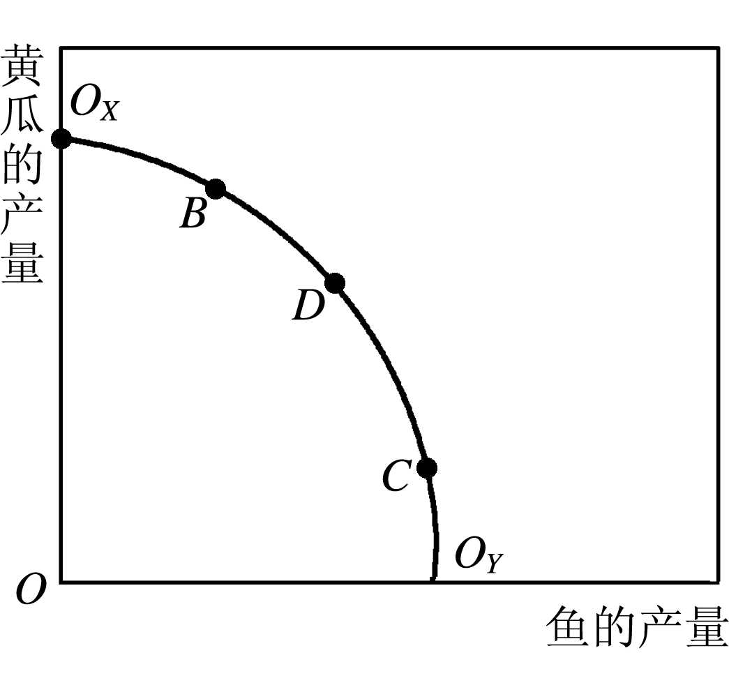 图2 生产契约曲线可以转换为“生产可能性边界”。图3以鱼的产量为横轴,黄瓜的产量为纵轴,给出生产可能性边界。图3中,在OX点,养殖鱼没有投入生产要素,产量为零;从原点O越向右的方向,其产量越高。在OY点,种植黄瓜没有投入生产要素,产量为零;从原点O越向上的方向,其产量越高。生产可能性边界上的点对应着生产契约曲线上的点,表明在两种产品间通过投入要素的转换而达到最优配置时每种产品的不同产量水平的组合。不在生产可能性边界上的点,均为无效率配置点。在完全竞争市场均衡中,任两种投入要素的边际技术替代率等于这两种投入要素的价格之比。以PL代表劳动的价格,PK代表资本的价格,MRTSLK代表劳动对资本的边际技术替代率,则上述条件为: MRTSLK=PL/PK 在完全竞争市场中,所有生产者面对的是既定的、相同的要素价格比率,因此他们的边际技术替代率均相等。这正满足了帕累托最优配置的生产条件。