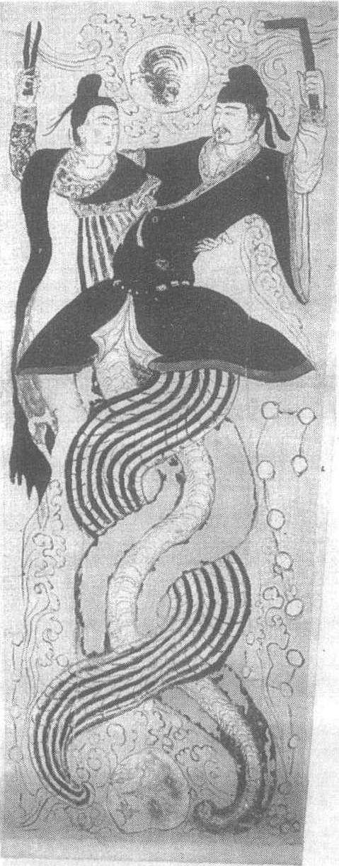| 释义 | 帛画伏羲女娲图 帛画伏羲女娲图唐。绢本设色。纵220厘米,横80.9至116.5厘米。新疆维吾尔自治区吐鲁番出土。新疆维吾尔自治区博物馆藏。图中男、女二人,人身蛇尾,两相拥持,长尾交绕,侧身对立。伏羲氏细目、微须、乌帽、黑袍,左手举矩尺,右手攀住女娲的脖项。女娲氏丰颐红润,乌发高绾,饰花钿,佩耳环,彩衫长裙,披帛飘垂,右手持圆规,左手揽在伏羲的腰间。二人周围点缀着日、月、星辰和云气。日中有金乌,月中有玉兔、蟾蜍、桂树,用以象征冥阔的宇宙空间,反映了希望墓主人死后升天的思想。此图线条粗细结合,并以浓淡不同的墨色衬出衣纹的褶皱。