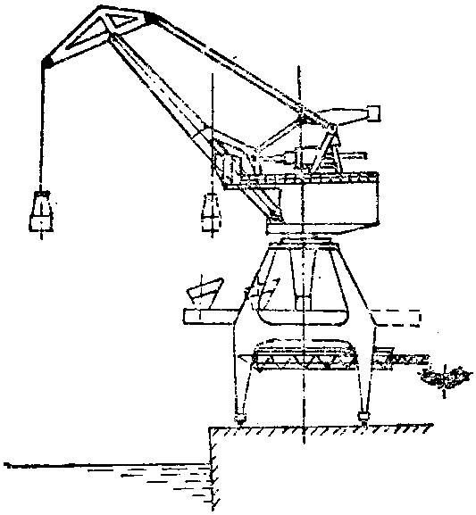 | 释义 | 带斗门座起重机 带斗门座起重机简称带斗门机。是高效的抓斗卸船机之一。其结构基本上与普通门座起重机相似,不同的是它在门架上装有漏斗及胶带输送机系统。它只用抓斗进行散货卸船作业。作业时,抓斗从船舱内抓取散货后,经起升、变幅动作将散货卸入机上漏斗,再经胶带输送机把货物输送到货场上。它的起升速度和变幅速度均比普通型门座起重机高,且作业行程短,因而采用它卸散货船舶可获得较之普通型门座起重机更高的生产效率。特别适合在散货专业化码头上工作。如图示。
