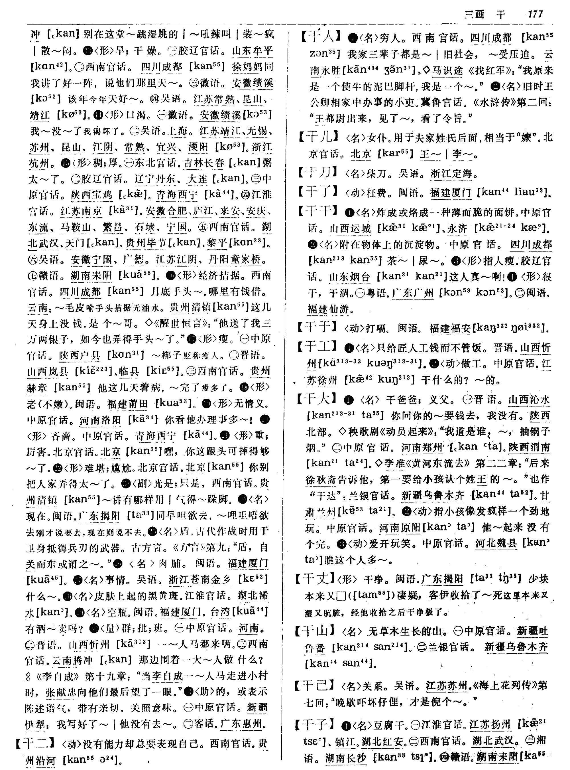 | 释义 | 干人 干人官府的小吏。 ☚ 小苏学士 遭际 ☛ 干人gan1ren2(名) (~儿)穷人。 干人kan55ʐən21gan55ren21穷人。清刘省三《跻春台》卷二《审豺狼》: “有钱的人莫得门势,处处被人相欺,时时受人闷气,任你家财万贯,还当不得我们干人。”“干人”与“有钱人”前后对举,其义自明。蹇先艾《贵州道上》: “至于这班抬短路的……多半是烟癖很深,无家可归的二十多岁的干人。”原注: “干人即无父母,永远漂流糊口的人,迹近乞丐。”艾芜《一个女人的悲剧》: “你们一家人,都是好心好肠的,做起生意来,总不会叫我们干人吃亏!”注: “干人: 就是穷人。”下江人《释四川话 (二)》: “贫无立锥,又无职业的无产阶级,叫做 ‘干人’。” (《旅行杂志》 1945/7/18) 〗。 〗。![]() ![]() 干人宋朝一种差役,给富豪和官员家办事。《水浒传》第二回:“次日,写了一封书呈,使人干人,送高俅去那小王都太尉处。” |