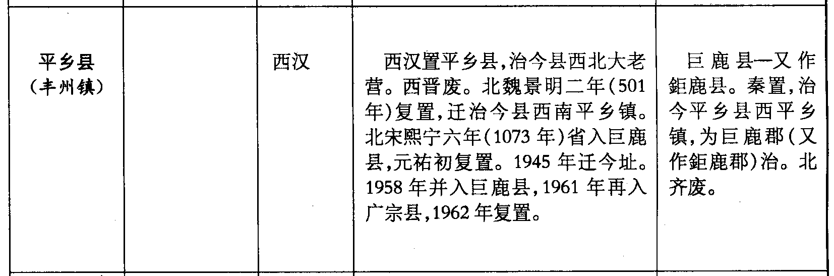 平乡县(丰州镇)西汉西汉置平乡县,治今县西北大老营。西晋废。北魏景明二年(501年)复置,迁治今县西南平乡镇。北宋熙宁六年(1073年)省入巨鹿县,元祐初复置。1945年迁今址。1958年并入巨鹿县,1961年再入广宗县,1962年复置。巨鹿县—又作鉅鹿县。秦置,治今平乡县西平乡镇,为巨鹿郡(又作鉅鹿郡)治。北齐废。