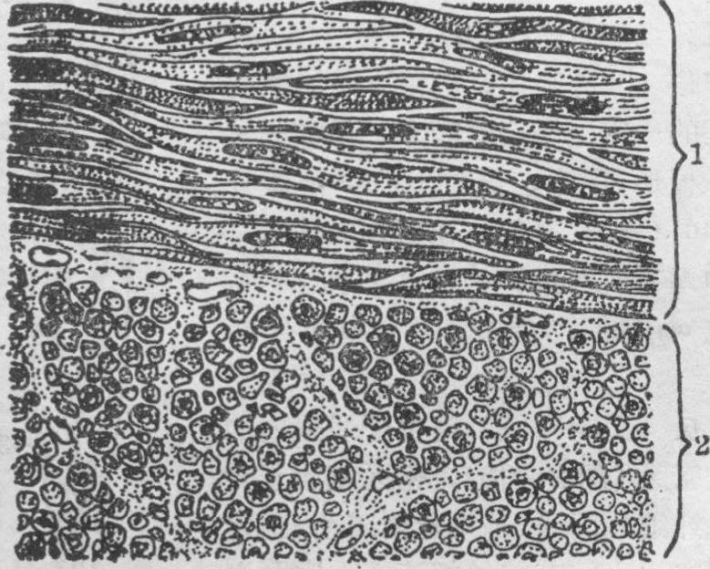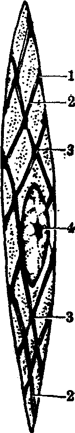 图3 平滑肌纤维纵切面超微结构模式图 1.密区 2.中间丝 3.密体 4.细胞核 密体 又称暗体,电镜下是肌浆中散在的一些电子密度较大、呈椭圆形或长梭形小体,长约0.5μm,直径0.1μm,(图2、图3)。在密体的浓密基质中埋有肌丝束,构成此种肌丝的蛋白是α-辅肌动蛋白,并与中间丝相连。 密区 又叫密斑,是位于肌膜内面的浓密区(图2、图3)。密区相当于骨胳肌纤维的间线,是细丝附着所在。密区和密体之间有细丝相连接。密区之间常有质膜小泡群集。因密体与密区结构相似,故近来统称为密体. 肌浆网 平滑肌的肌浆网发育较差,呈泡状或管状,存在于质膜小泡周围和肌丝之间,并常紧靠质膜小泡。平滑肌无横小管系统。质膜小泡相当于横小管,与细胞外界相通,可起电偶联作用。质膜小泡可贮存或释放Ca2+,同骨胳肌的兴奋-收缩偶联相当。 胞浆中线粒体呈椭圆形或长杆状,多分布在核的两端。粗面内质网不甚明显,有许多散在的核糖体、微管和糖原颗粒,高尔基复合体位于核的一端。偶见少量脂滴。 平滑肌纤维收缩机理 平滑肌的收缩特点是收缩缓慢,作用持久,耗能较少。依生理特征可将平滑肌收缩方式分为二种,一是自发而有周期性的收缩,称节律性收缩,如消化管壁的平滑肌,其收缩作用可发自肌纤维本身,又称肌源自动节律;另一种是持续收缩,称为紧张性收缩,如血管壁的平滑肌经常保持一定程度的紧张性收缩,以维持血管的口径和调节血压。平滑肌收缩的机理目前还不甚清楚。Danner和Honig(1967,1970)提出粗丝与细丝相互滑动引起肌纤维收缩。肌纤维舒张时,密区与密体之间相距较远,肌球蛋白处于解聚状态,不易见到粗丝。当肌纤维收缩时,肌球蛋白聚合成粗丝,粗丝横桥附于细丝上,从而引起肌丝间的滑动,同骨胳肌的粗、细丝滑动的机理相似(参见“骨胳肌”条)。粗丝和细丝相互产生应力作用于密区、密体,致使密区之间、密区与密体之间的距离缩短和移位,从而使细胞膜变成波纹状,细胞长轴缩短,通过中间丝传给相邻的密体和密区,使一条肌纤维收缩具有同步性。肌纤维收缩时,细胞核变粗、变短,甚至呈螺旋状。 平滑肌纤维的连接和神经支配 平滑肌纤维间的连接主要是缝隙连接。有些器官平滑肌纤维间还可见少量桥粒。缝隙连接电阻低,易形成电偶联,兴奋从一个肌纤维迅速传到另一肌纤维,使肌纤维同时收缩。 平滑肌纤维由自主神经支配。神经末梢呈念珠状膨大,直径达100nm或更大。各个神经纤维末端膨大与平滑肌纤维间的相互关系,在不同器官中差别较大。在神经与肌纤维连接处,基膜中断,此处呈现10~30nm的密区。末梢膨大部释放神经递质,与肌膜上的受体结合,使平滑肌产生收缩。分布于平滑肌的神经可分为三种,即胆碱能神经、肾上腺素能神经和嘌呤能神经。 按神经末梢的分布方式,平滑肌纤维分为神经直接支配细胞和非神经直接支配细胞。只有少数平滑肌纤维属于神经直接支配的,但有些器官如输精管、虹膜的平滑肌中多数甚至全部肌纤维都有神经末梢附着,直接受神经控制。非神经直接支配细胞又分为偶联细胞和间接偶联细胞。偶联细胞是指与神经直接支配细胞藉缝隙连接相偶联的平滑肌细胞; 间接偶联细胞是指与偶联细胞相偶联的细胞。当神经直接支配的肌纤维受神经刺激产生兴奋时,冲动先传到偶联细胞,然后顺序传到间接偶联细胞,从而引起许多肌纤维同时发生收缩。其传递冲动的结构基础是缝隙连接。消化管、子宫和多数血管的大部平滑肌纤维是属于偶联细胞或间接偶联细胞。平滑肌的收缩活动除受神经支配的控制外,某些机械性、电或化学的直接刺激也可引起肌纤维的收缩。 平滑肌的增生和再生 平滑肌纤维分化程度较低,在某些情况下可进行分裂繁殖,也可由未分化的间充质细胞演变而来。间充质细胞首先伸长,逐渐变成纺锤形,核变成椭圆形,胞质内出现肌丝,进而形成平滑肌纤维。当器官组织发生机能性或病理性变化时,肌纤维体积增大、数量增多,以适应机能需要,称适应性肥大和增生。典型的生理性肥大和增生是妊娠期的子宫平滑肌,平时肌纤维长约40~60μm,妊娠时可达250~600μm,肌浆中粗面内质网增多,高尔基复合体明显。肌纤维的数量也增加,主要由未分化的间充质细胞分化而来,但也常见有丝分裂相。病理性肥大和增生,如高血压患者的动脉壁,可出现平滑肌变大、增多。在建立侧支循环时,新形成的血管壁平滑肌来自未分化的间充质细胞。 平滑肌的再生能力比骨胳肌和心肌强。内脏器官和血管壁的创伤修复过程中,平滑肌也由未分化的间充质细胞和伤面附近正常肌细胞分裂增殖,填补缺损。但新生的肌纤维往往不能全部弥合创伤,其剩余部分由结缔组织填充,形成瘢痕组织。 ☚ 心肌 神经组织 ☛ 平滑肌non-striated (/smooth)muscle |