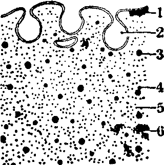 图2 平滑肌纤维横切面超微结构模式图 1.密区 2.质膜小泡 3.粗丝 4.中间丝 5.细丝 6.密体 肌丝 占肌浆的大部分,排列很不规整,与细胞长轴呈一定角度,也由粗丝和细丝组成,但无肌节和横纹。细丝直径约5nm,是由肌动蛋白、原肌球蛋白 (其含量高于骨胳肌) 和另一种与收缩有关的平滑肌蛋白组成。细丝从密区起始,沿肌纤维长轴斜向伸到细胞中央,止于密体或游离于胞质中。粗丝较稀少,直径约15nm,其化学成分是肌球蛋白,分布不如骨胳肌中的规律,其间杂有细丝(图2)。粗丝间距为10~40nm。粗、细丝数量的比例为1:10~20,细丝围绕着粗丝排列,横切面呈花环状或六角形。肌球蛋白须在0.5mM浓度以上的二价正离子(尤其是Mg2+)的存在下,才能聚合形成粗丝。肌纤维中还有直径为10nm的中间丝(图2)(参见“中间丝”条)。中间丝常附于密区和密体之间,功能是构成肌纤维的骨架(图3).