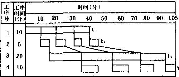 劳动对象在工序之间移动和工序之间在时间上衔接的一种时间组织方式。一批零部件在上道工序每加工完一件以后,就立即送往下道工序去加工,使一批零部件能同时在两个或两个以上的工序平行加工。这种方式生产周期最短,但在前道工序时间长,后道工序时间短的情况下,出现等待空闲时间,这些等待空闲时间很零碎,不能充分利用。如图示:
