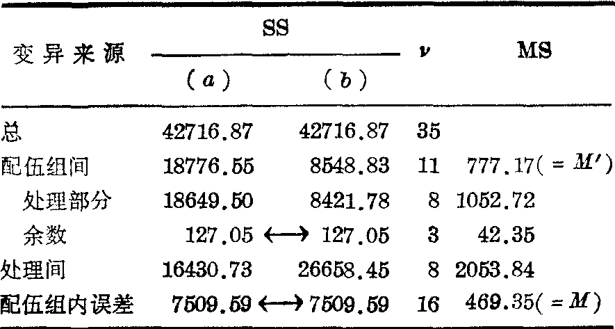 余数 式(2)-式(4)。(5) 配伍组间(消除处理影响)项则由 处理部分 ∑w2i/[rv(v-k) (k-1)] (6)与余数式(5)之和组成,即式(5)+式(6),式(6)中 wi=(v-k)Vi-(v-1)Ti+(k-1)G。(7)处理间(消除配伍组影响) ∑(kDi)2/(k2rE),(8)其中,kDi=kVi-Ti (9)是配伍组内处理的相差,当k>v/2时,用 kDi'=kVi十Ti'。(10) E为有效因子,